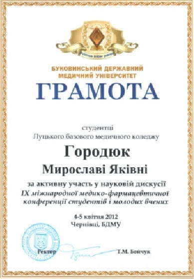 4-5 квітня в Буковинському державному медичному університеті відбулася ІХ Міжнародна медико-фармацевтична конференція студентів і молодих вчених. Участь у ній брали студенти ЛБМК Оліярник Сергій і Лук’янюк Лілія (спеціальність «Лікувальна справа») з доповіддю «Аналіз ринку хондропротекторів у м. Луцьку», науковий керівник О.Я.Андрійчук; Городюк Мирослава (спеціальність «Акушерська справа») з доповіддю «Ефективність впливу фізичних навантажень на діяльність кардіоваскулярної системи у студентів-гіпотоніків», науковий керівник Н.Р.Федонюк; Некращук Олеся (спеціальність «Сестринська справа») з доповіддю «Вагітна жінка як об’єкт психологічних досліджень», науковий керівник Т.В.Пастрик.