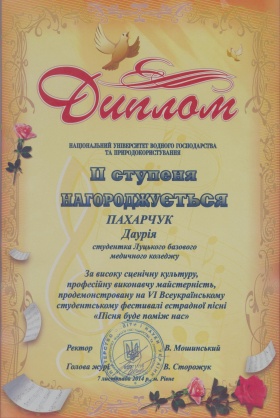 Даурія Пахарчук, студентка І курсу спеціальності «Лікувальна справа», була нагороджена дипломом ІІ ступеня за композицію «Ой верше, мій верше».